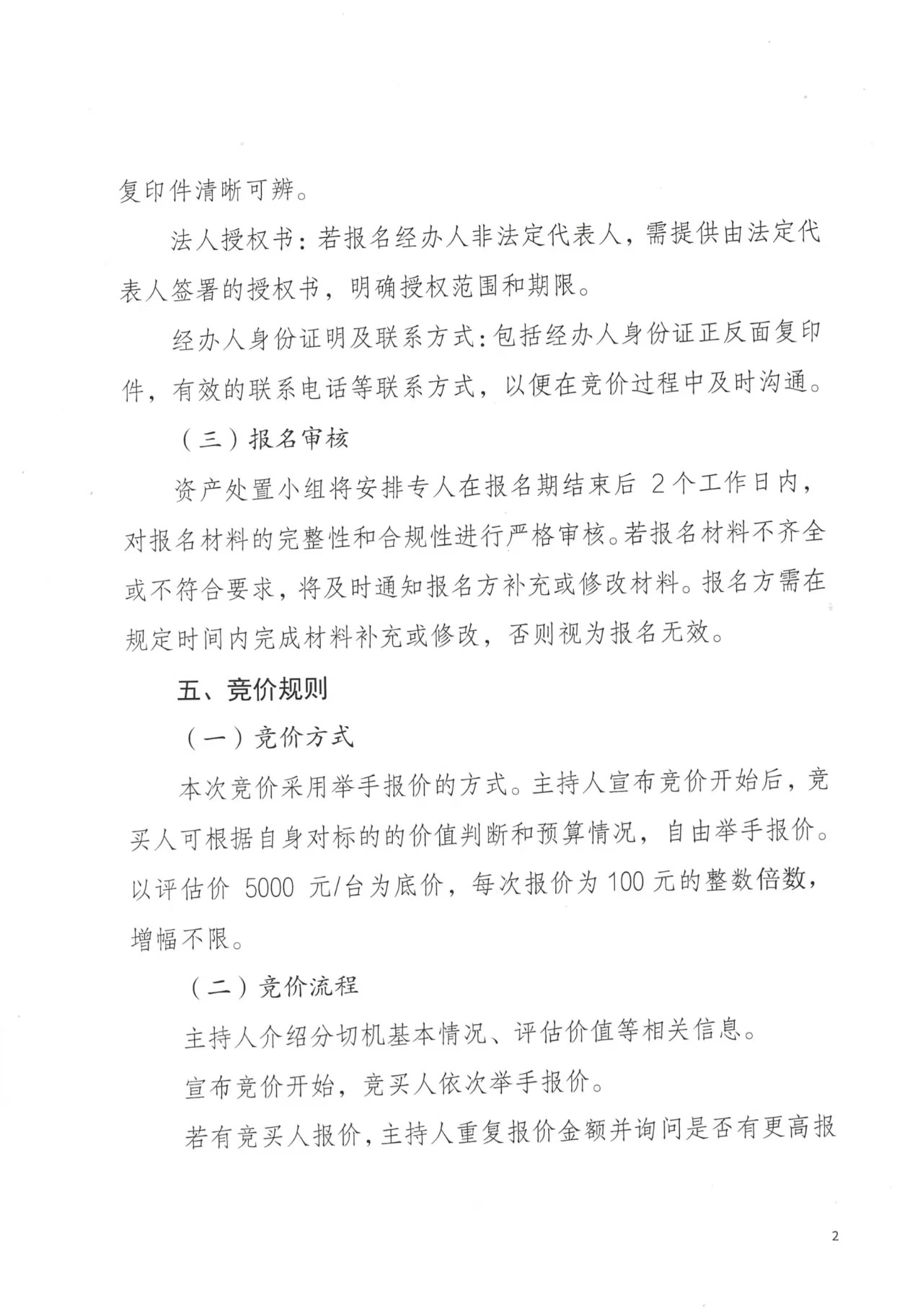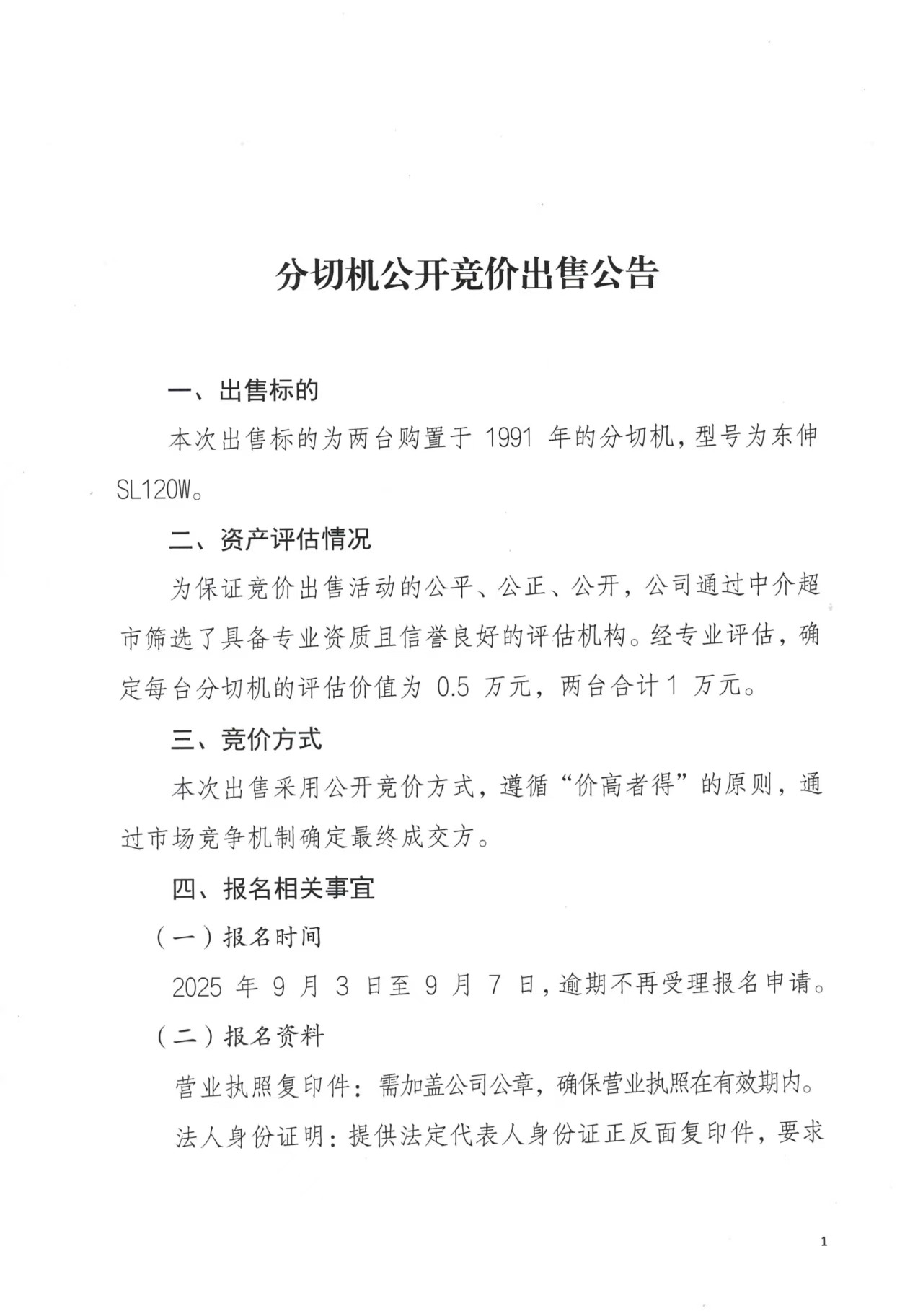 分切機(jī)公開競(jìng)價(jià)出售公告