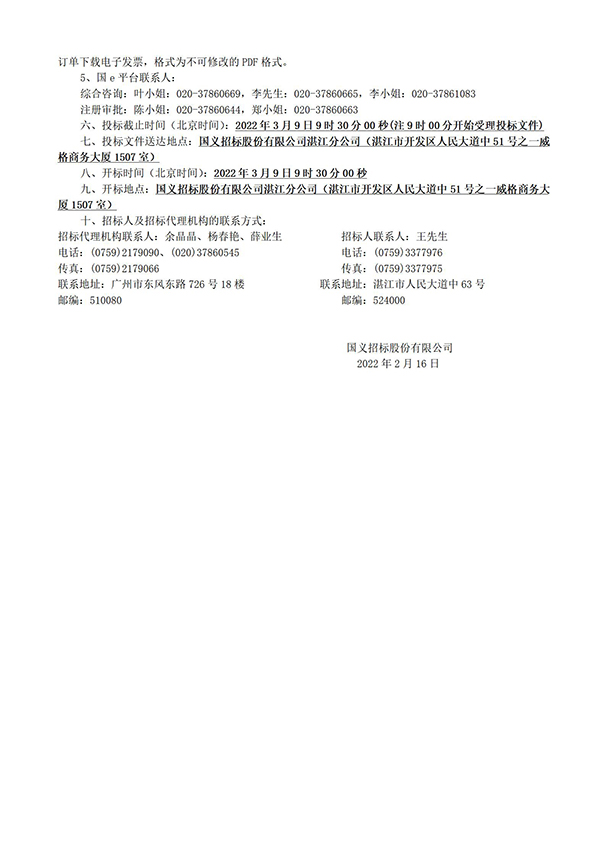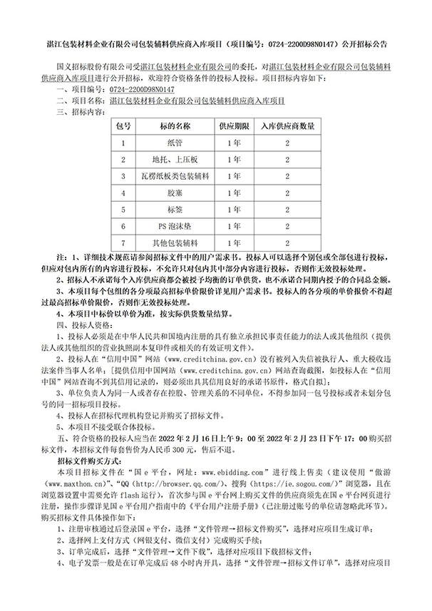 湛江包裝材料企業(yè)有限公司委托代理招標(biāo)方國義招標(biāo)股份有限公司對(duì)包裝輔料進(jìn)行公開招標(biāo),并于2022年2月16日在國e網(wǎng)(網(wǎng)址:www.ebidding.com)公開發(fā)布招標(biāo)公告。