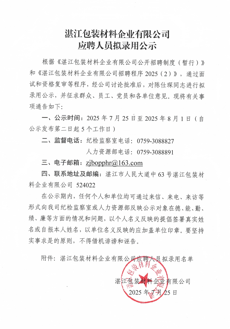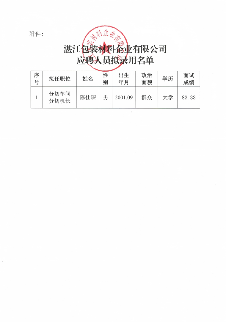 湛江包裝材料企業(yè)有限公司應(yīng)聘人員擬錄用公示